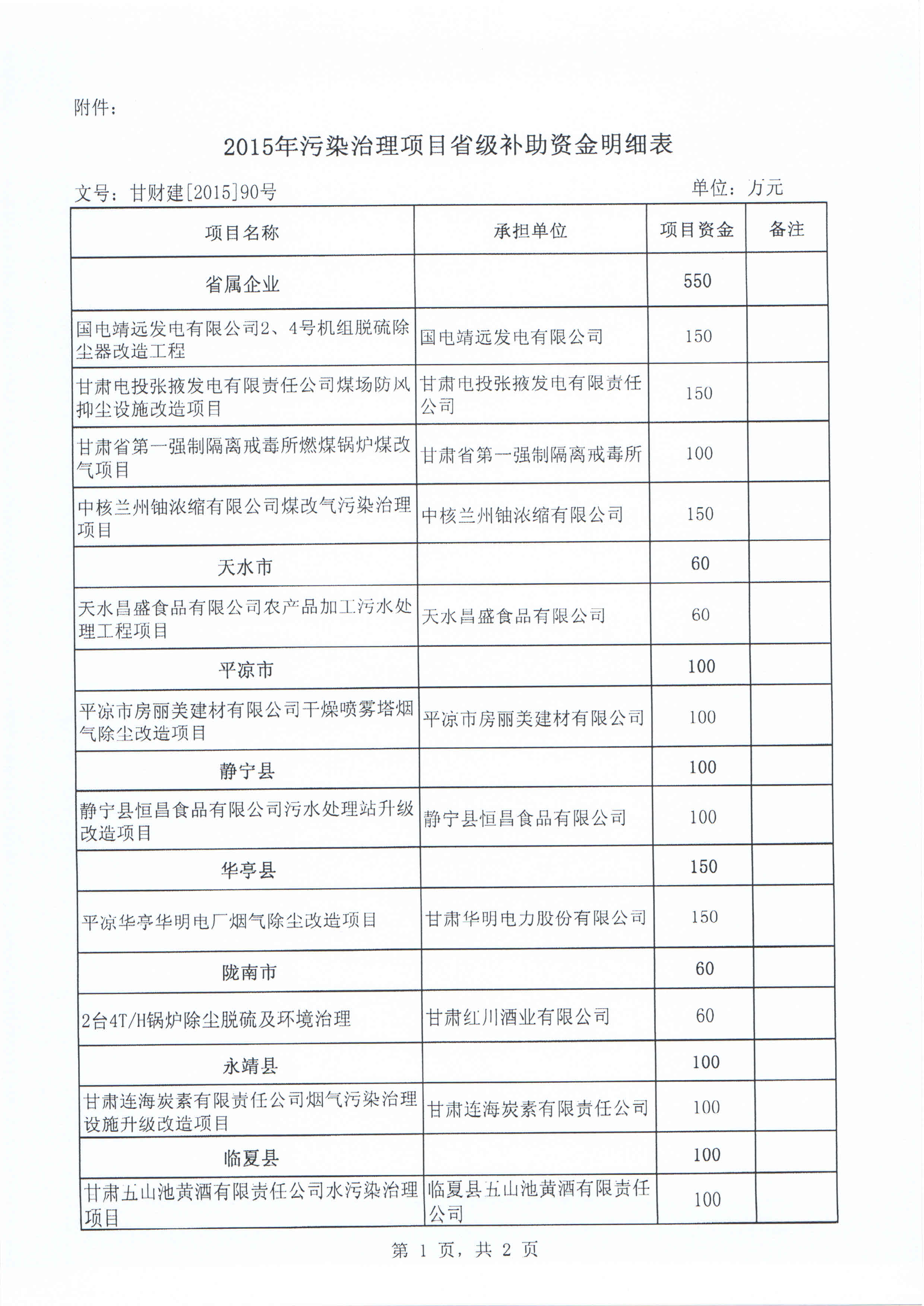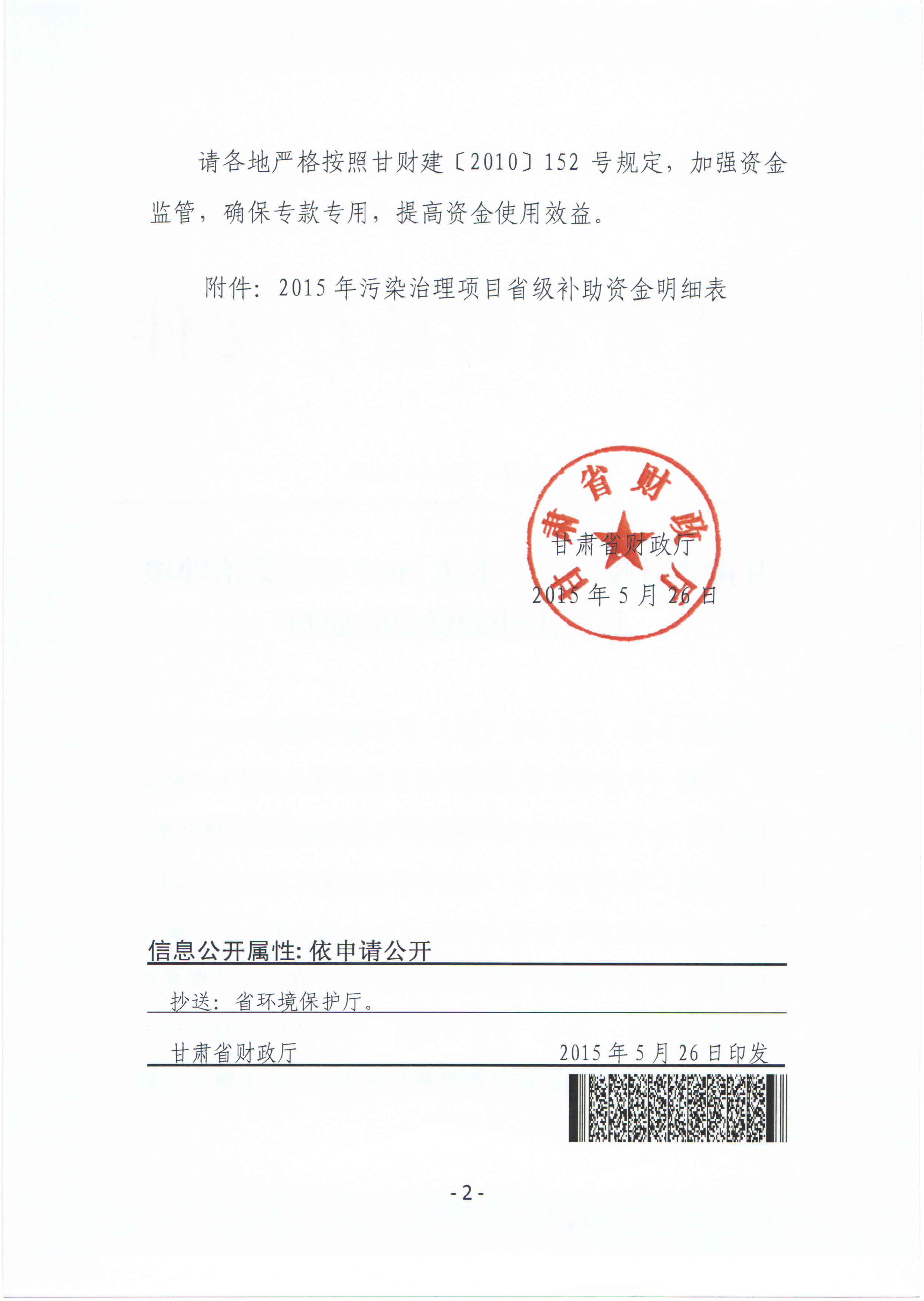 甘肃省财政厅关于下达2015年污染治理项目省级补助资金的通知