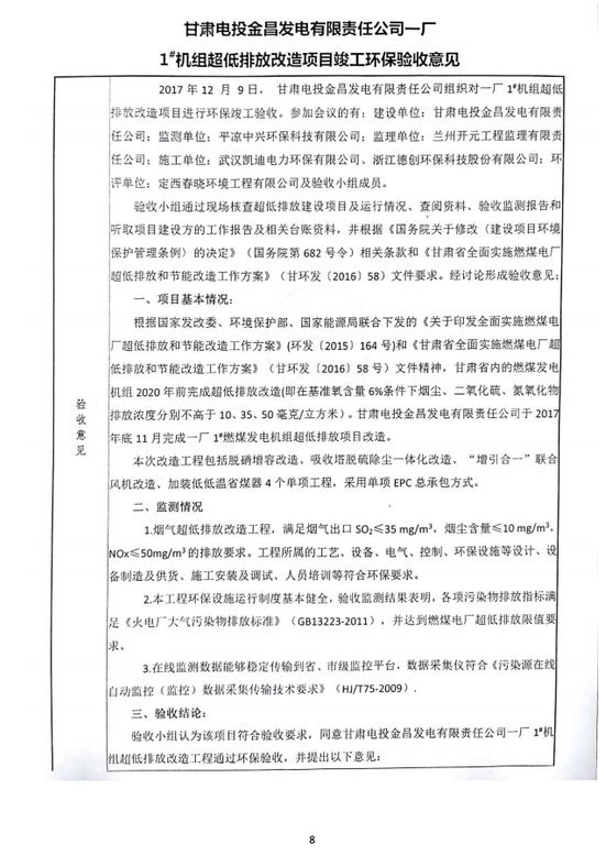 甘肃电投金昌发电有限责任公司2*330MW机组(1号机组、2号机组)超低排放改造项目(二厂)竣...