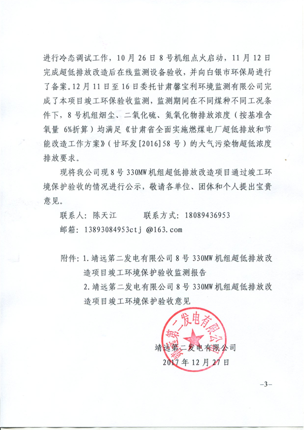 靖远第二发电有限公司8号330MW机组超低排放改造项目竣工环保企业自行验收公示