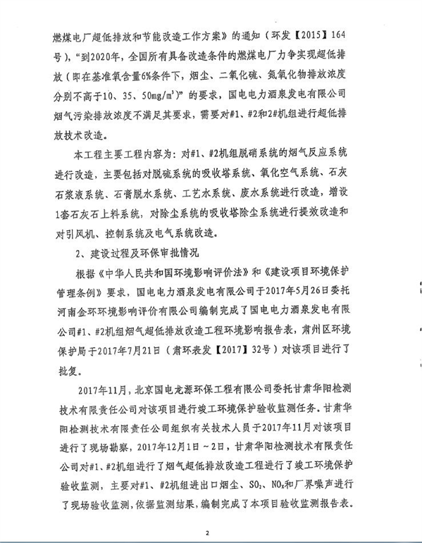 国电电力酒泉发电有限公司1#、2#机组烟气超低排放改造工程竣工环保企业自行验收公...
