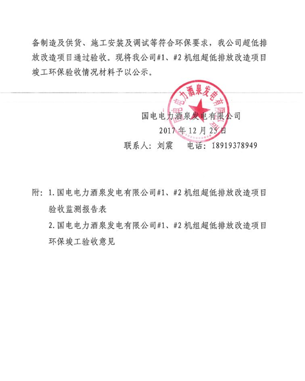 国电电力酒泉发电有限公司1#、2#机组烟气超低排放改造工程竣工环保企业自行验收公示