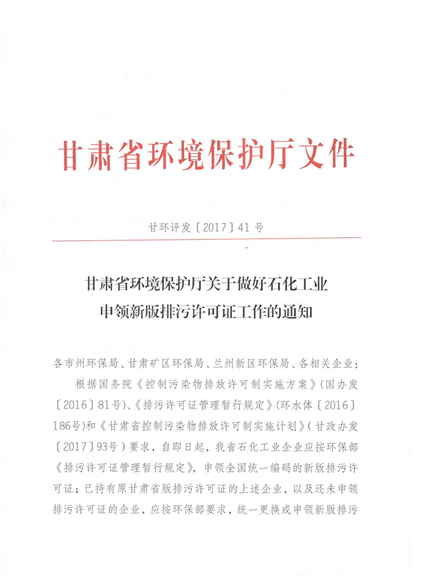 甘肃省环境保护厅关于做好石化工业申领新版排污许可证工作的通知