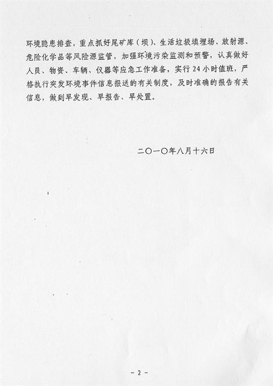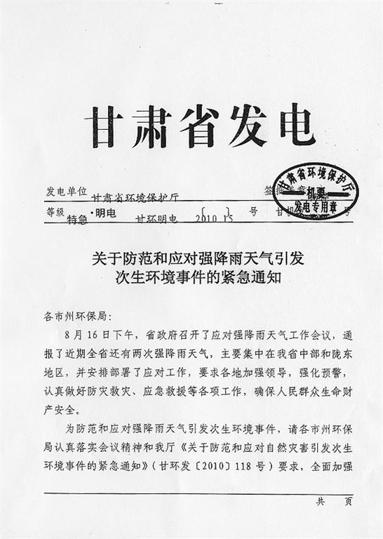 关于防范和应对强降雨天气引发次生环境事件的紧急通知(甘明电[2010]15号)