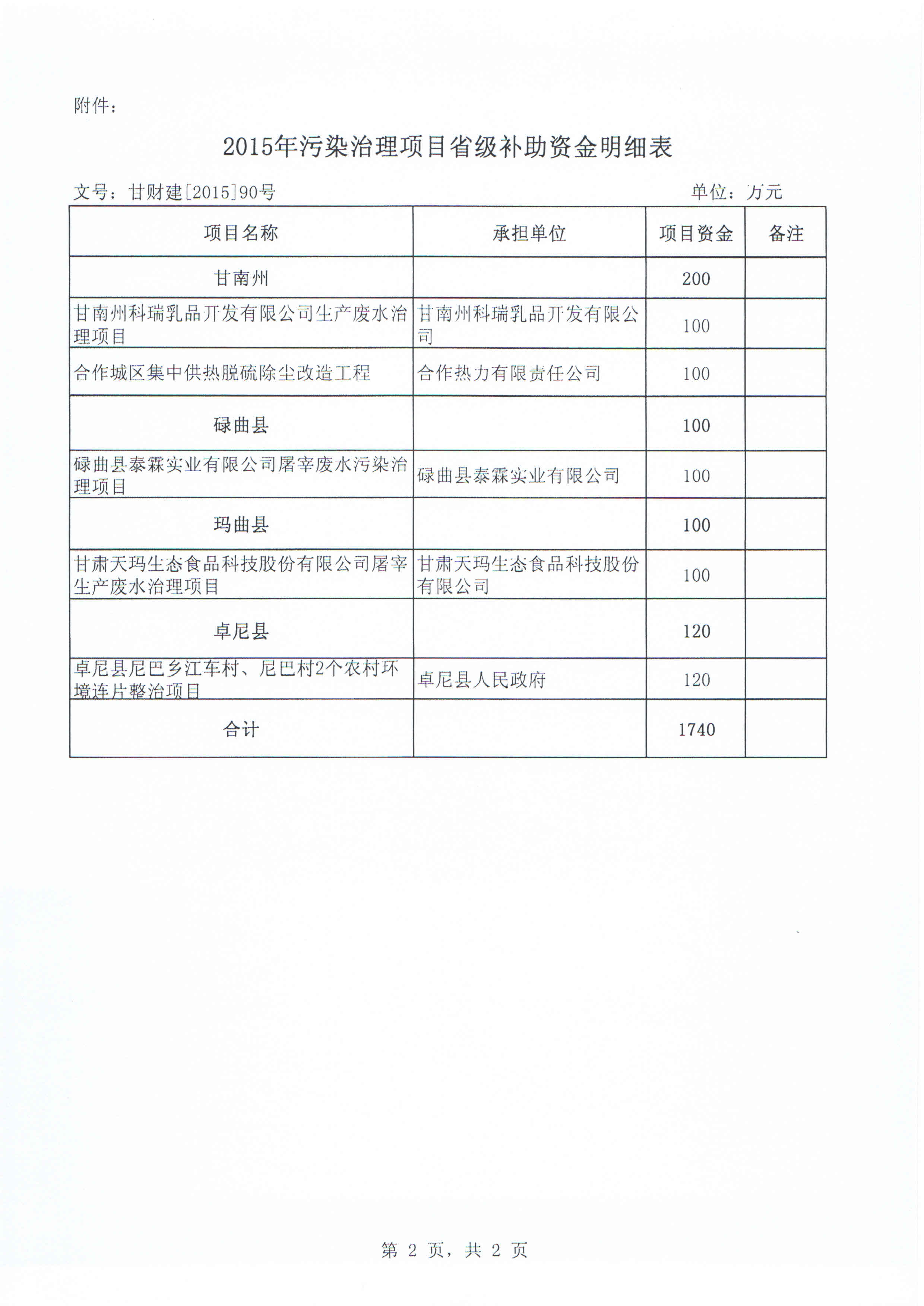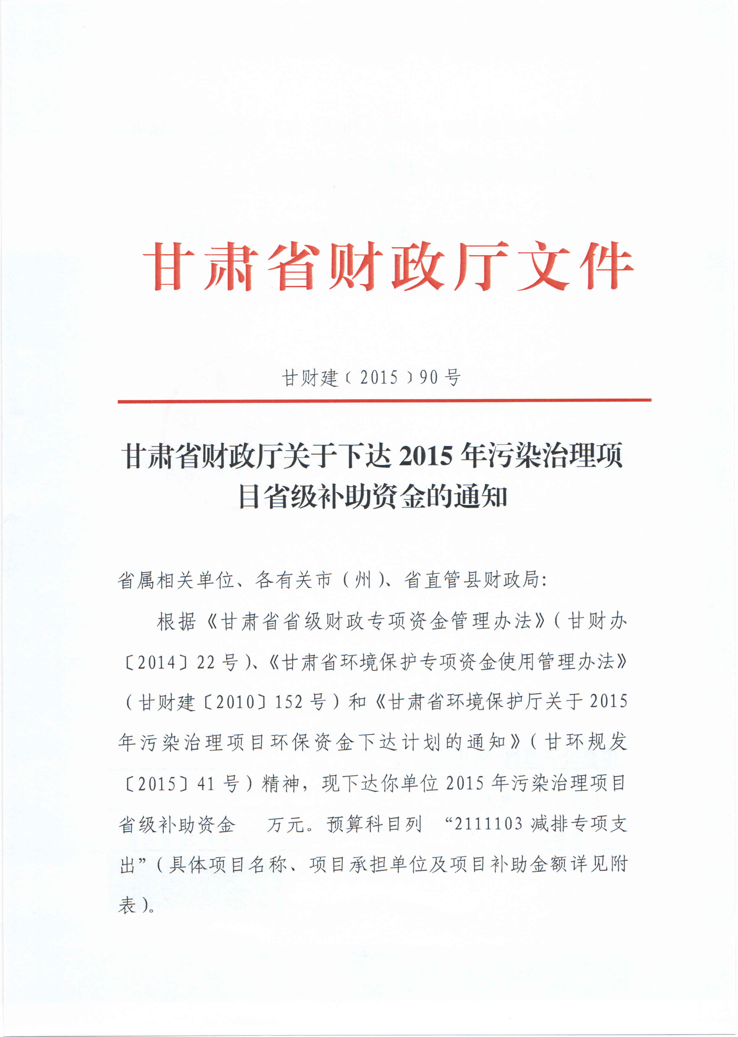 甘肃省财政厅关于下达2015年污染治理项目省级补助资金的通知
