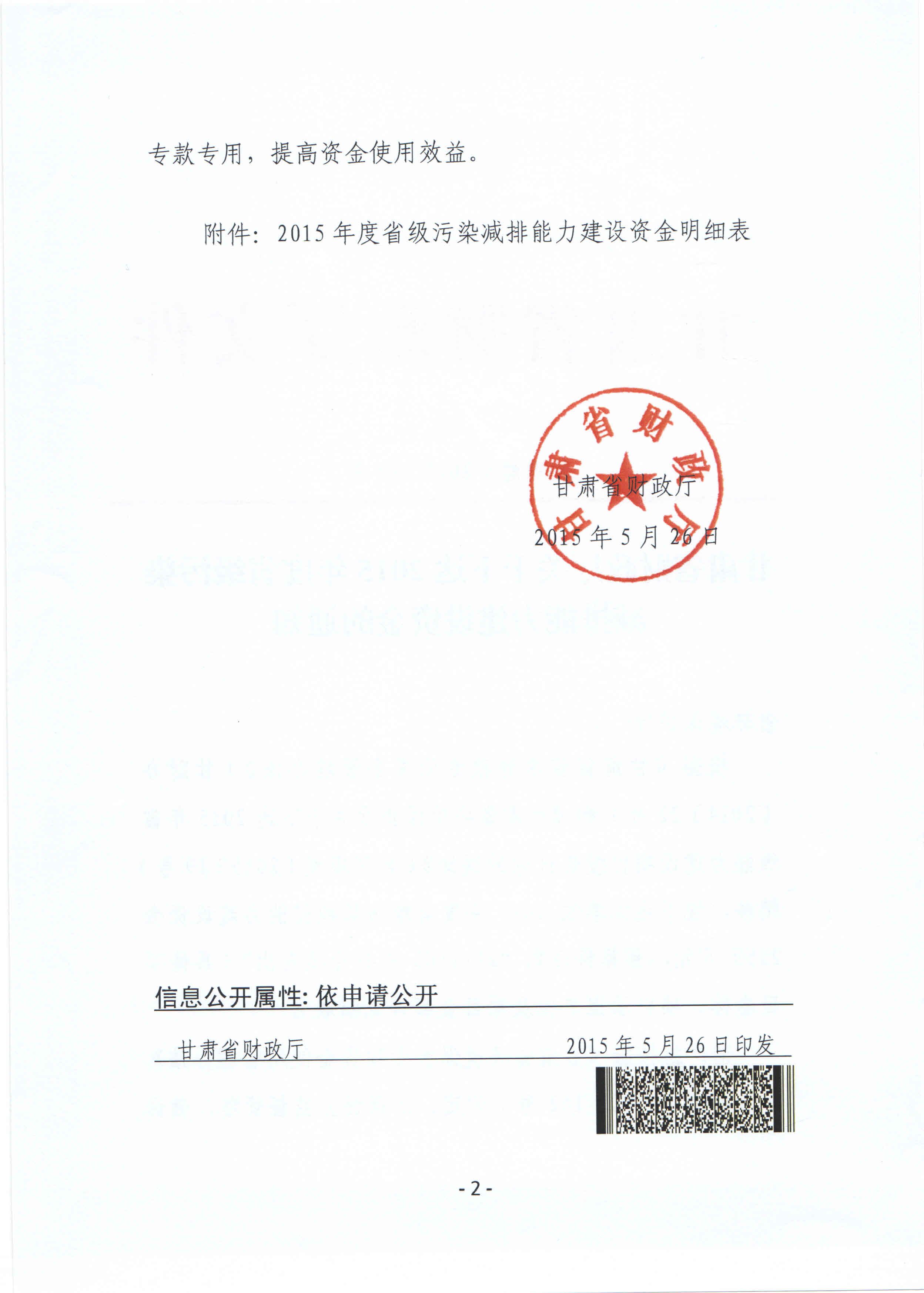 甘肃省财政厅关于下达2015年度省级污染减排能力建设资金的通知