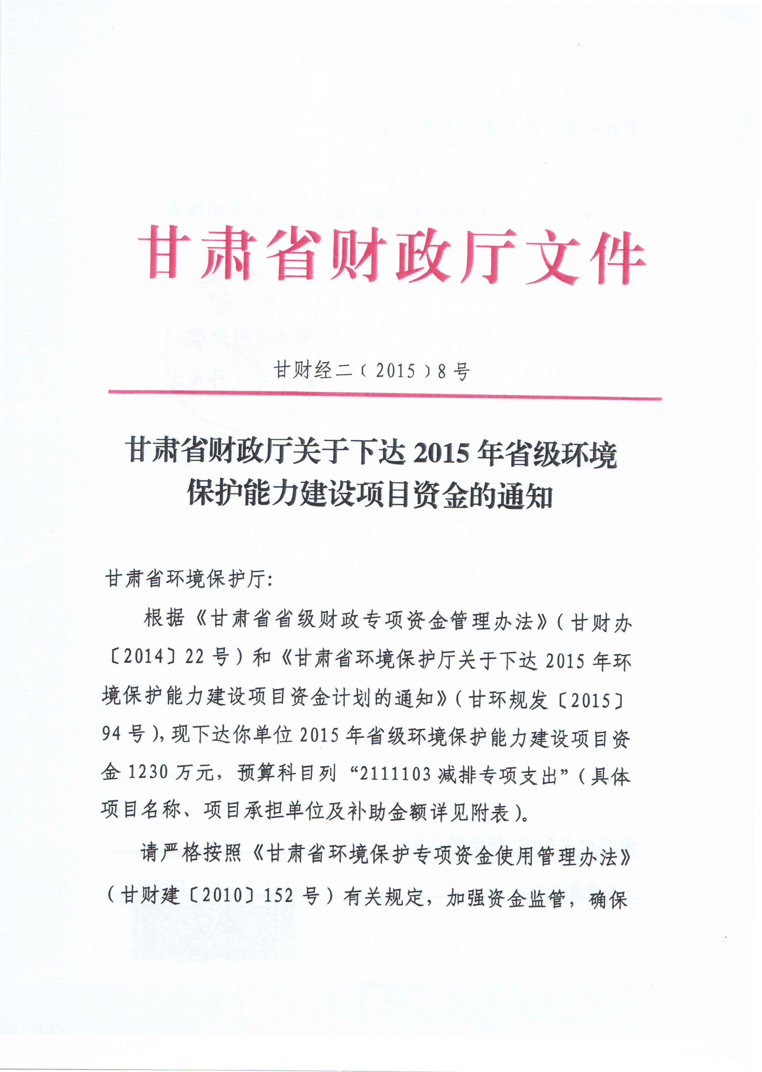 甘肃省财政厅关于下达2015年省级环境保护能力建设项目资金的通知