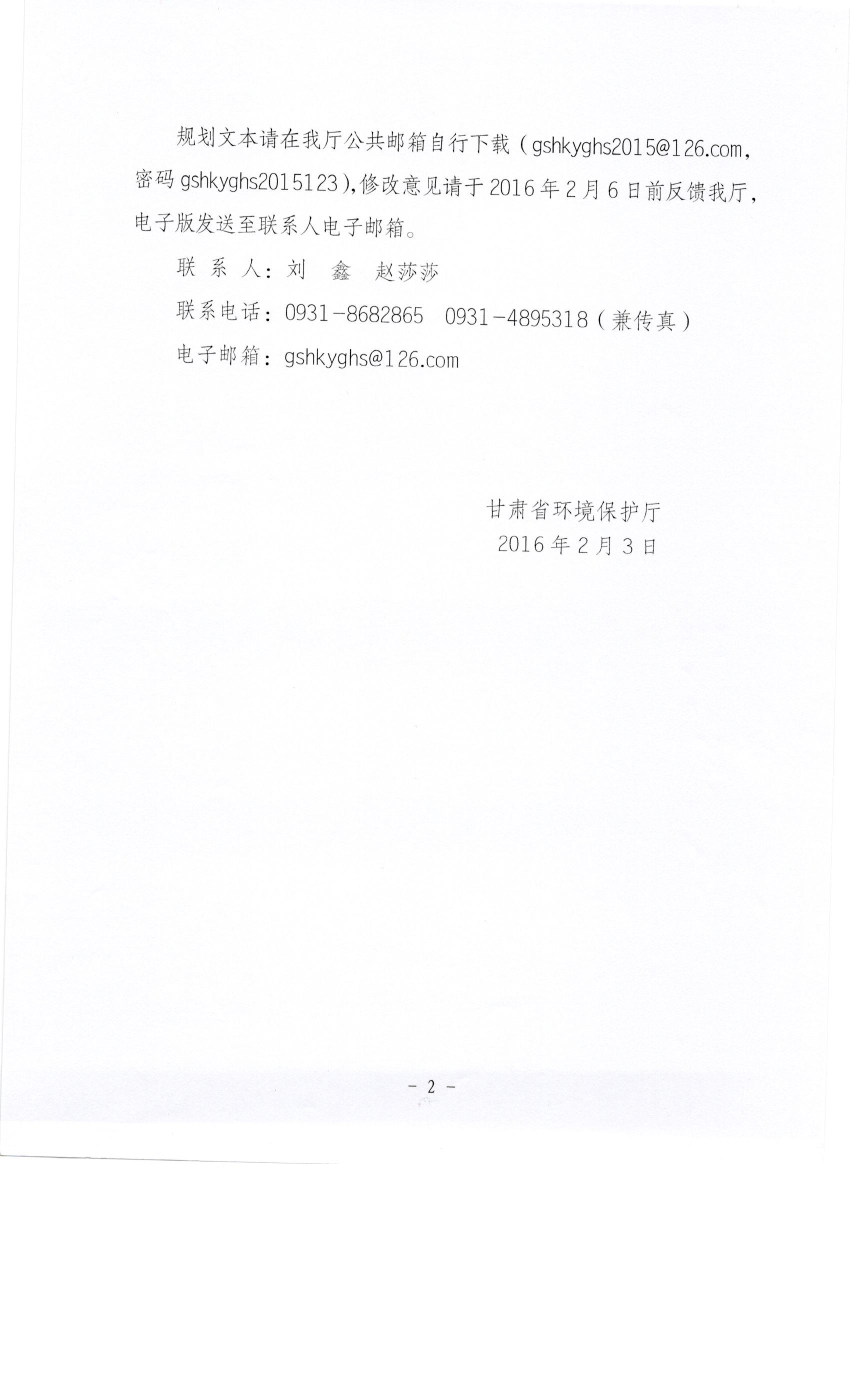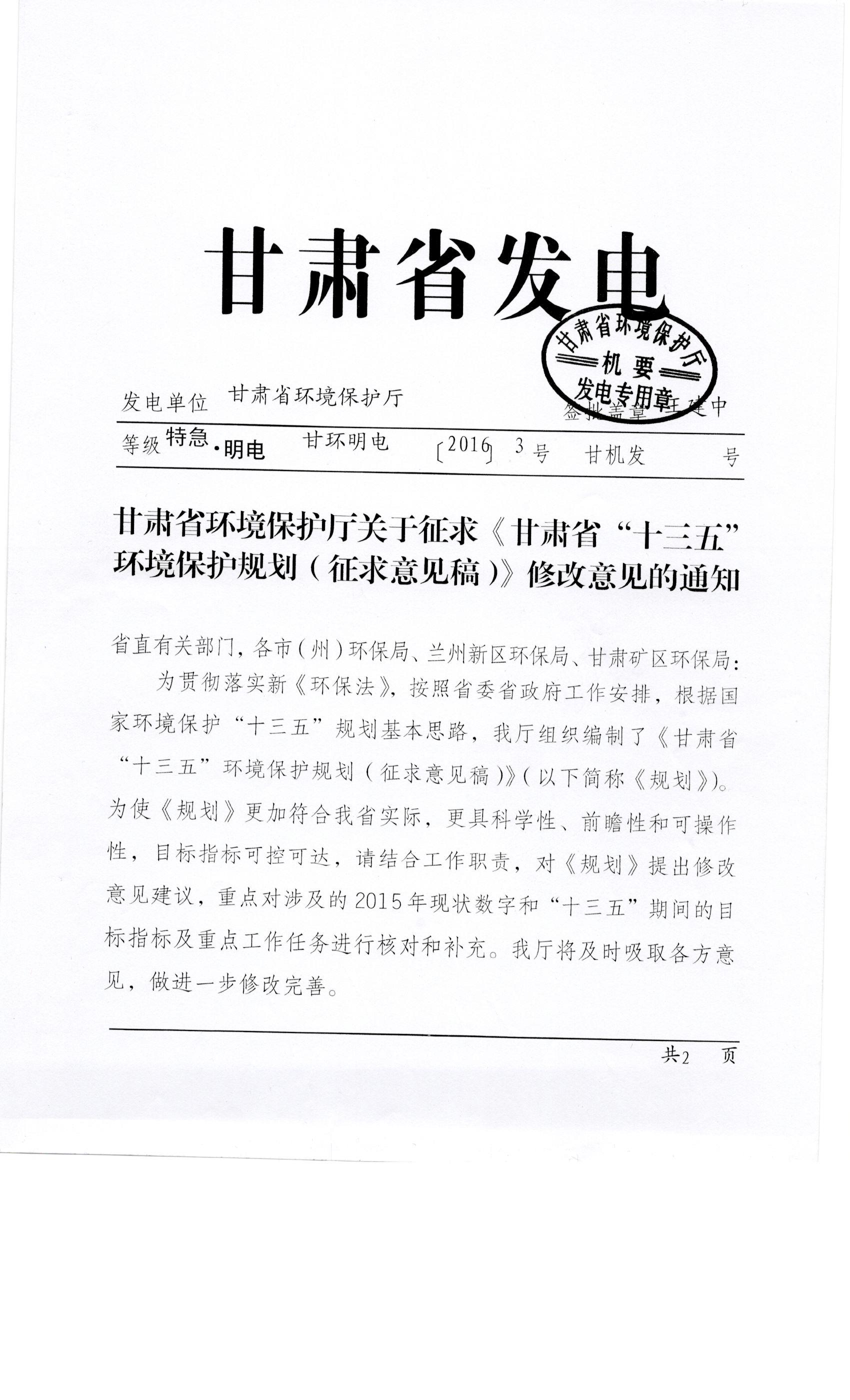 甘肃省环境保护厅关于征求《甘肃省“十三五”环境保护规划(征求意见稿)》修改意见的通知