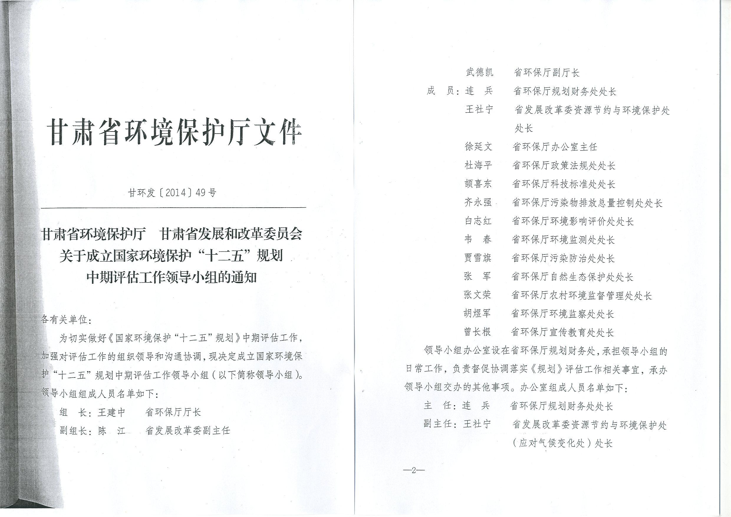 《甘肃省环境保护厅、甘肃省发展和改革委员会关于成立国家环境保护“十二五”规划中期评估工作领导小组的通知》,甘环发〔2014〕49号。