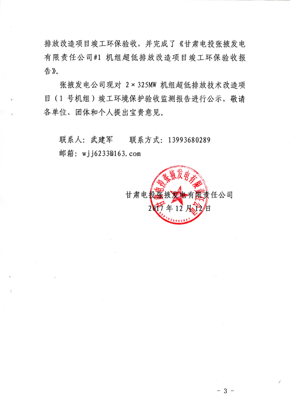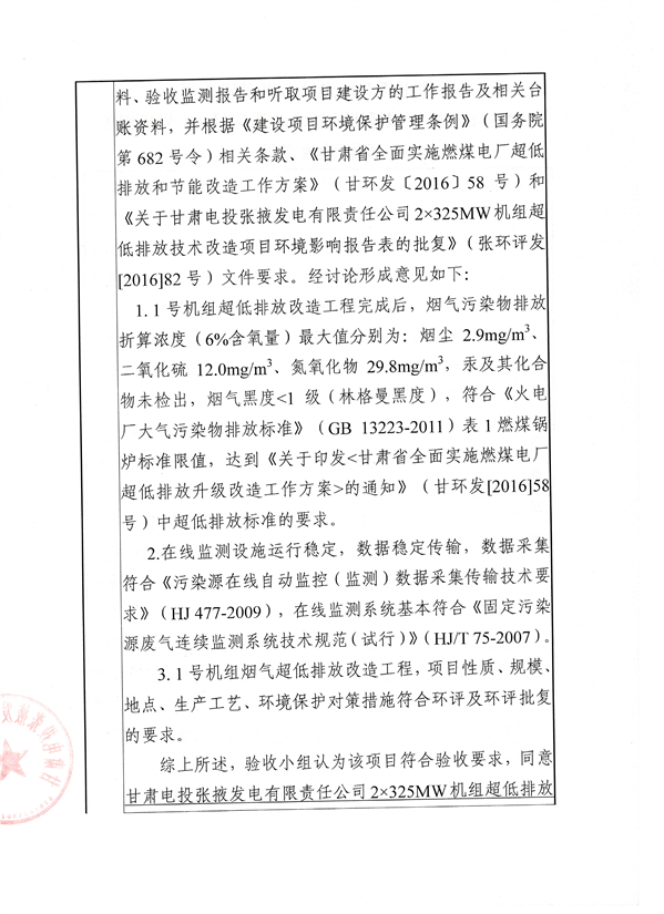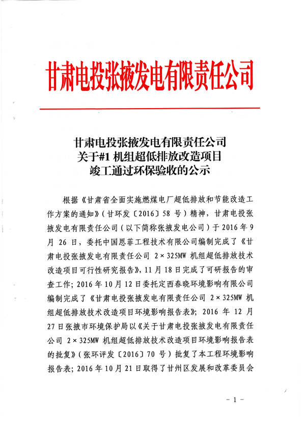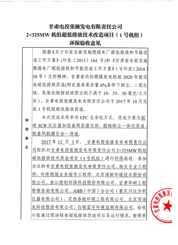 甘肃电投张掖发电有限责任公司2*325MW机组超低排放技术改造项目(1号机组)环保验收的公示