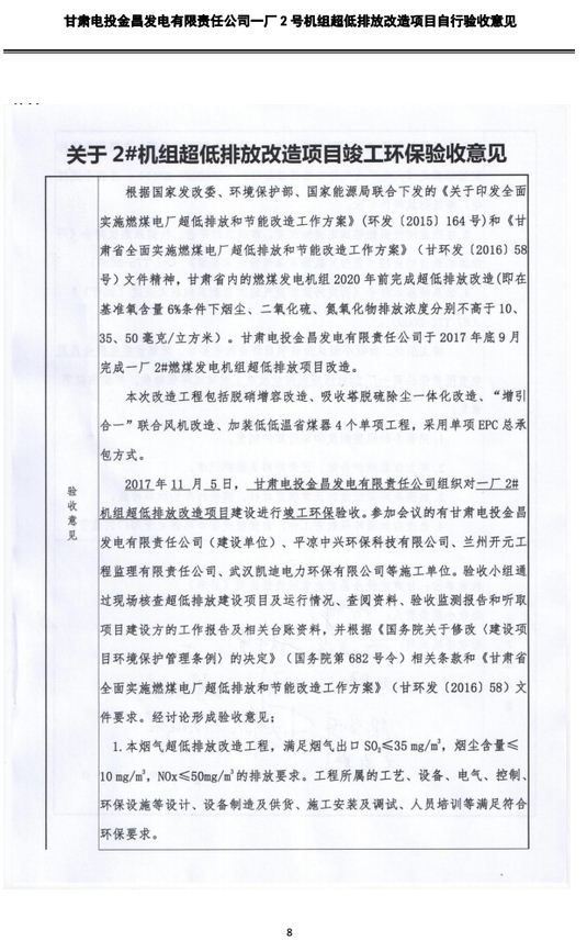 甘肃电投金昌发电有限责任公司2*330MW机组(1号机组、2号机组)超低排放改造项目(二厂)竣...