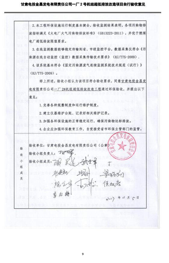甘肃电投金昌发电有限责任公司2*330MW机组(1号机组、2号机组)超低排放改造项目(一厂)竣工环保企业自行验收公示
