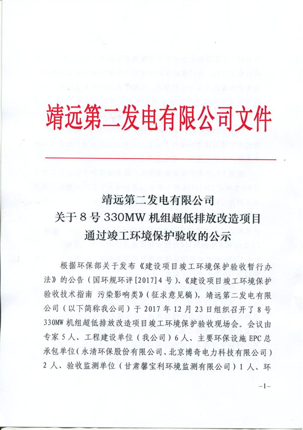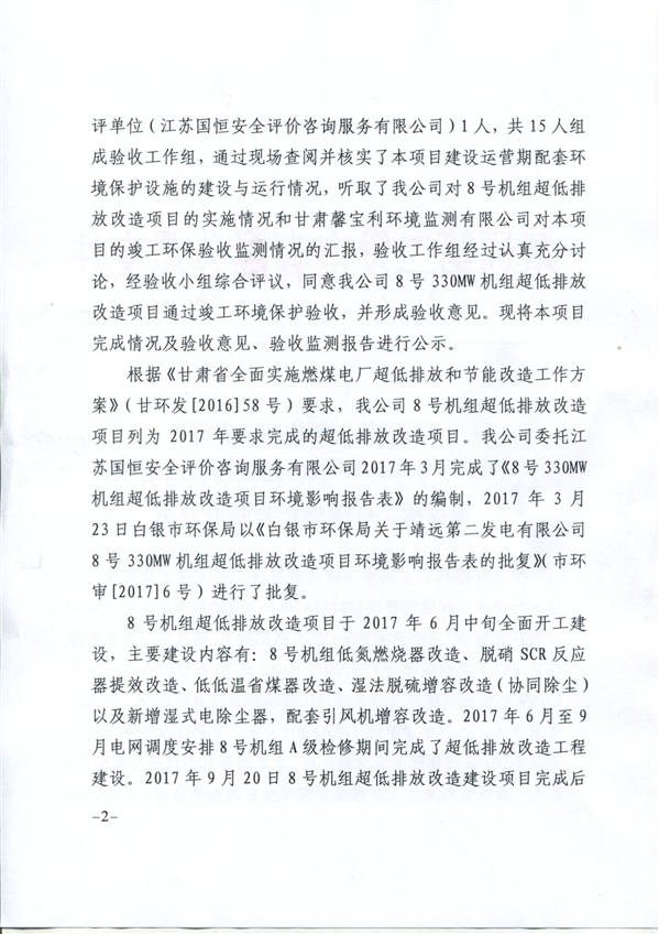 靖远第二发电有限公司8号330MW机组超低排放改造项目竣工环保企业自行验收公示