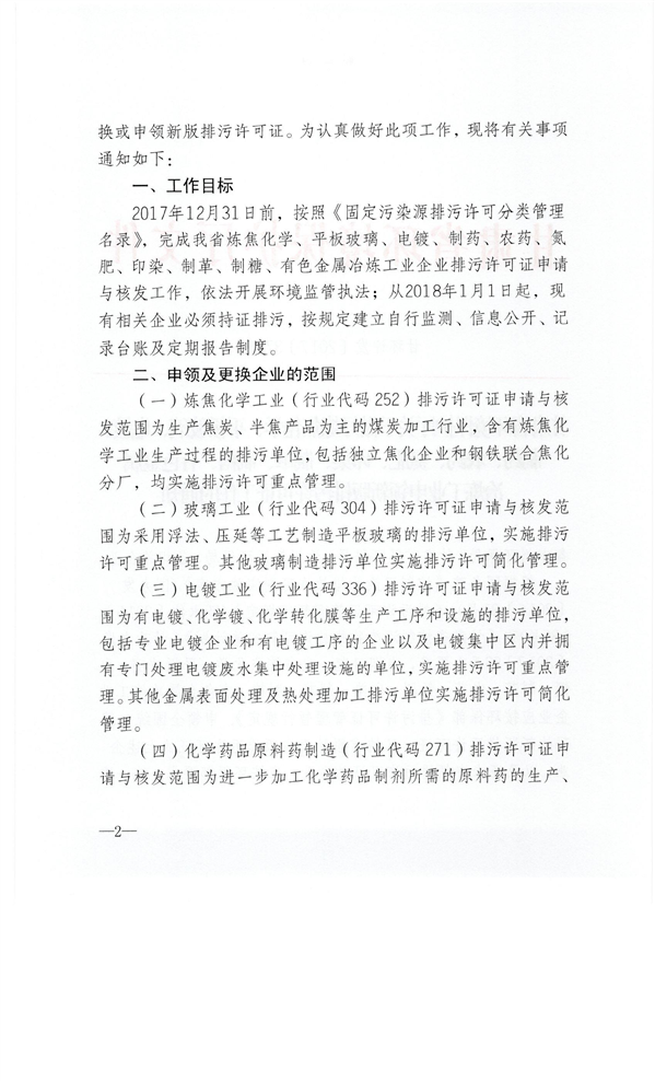 关于做好炼焦化学、平板玻璃、电镀、制药、农药、氮肥、印染、制革、制糖、有色金属冶炼工业申领新版排污许可证工作的通知