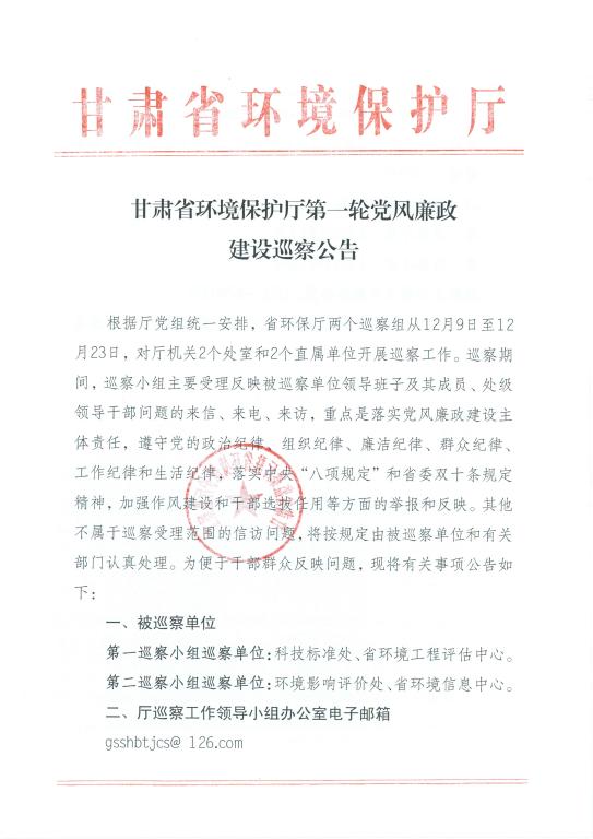 甘肃省环境保护厅第一轮党风廉政建设巡察公告