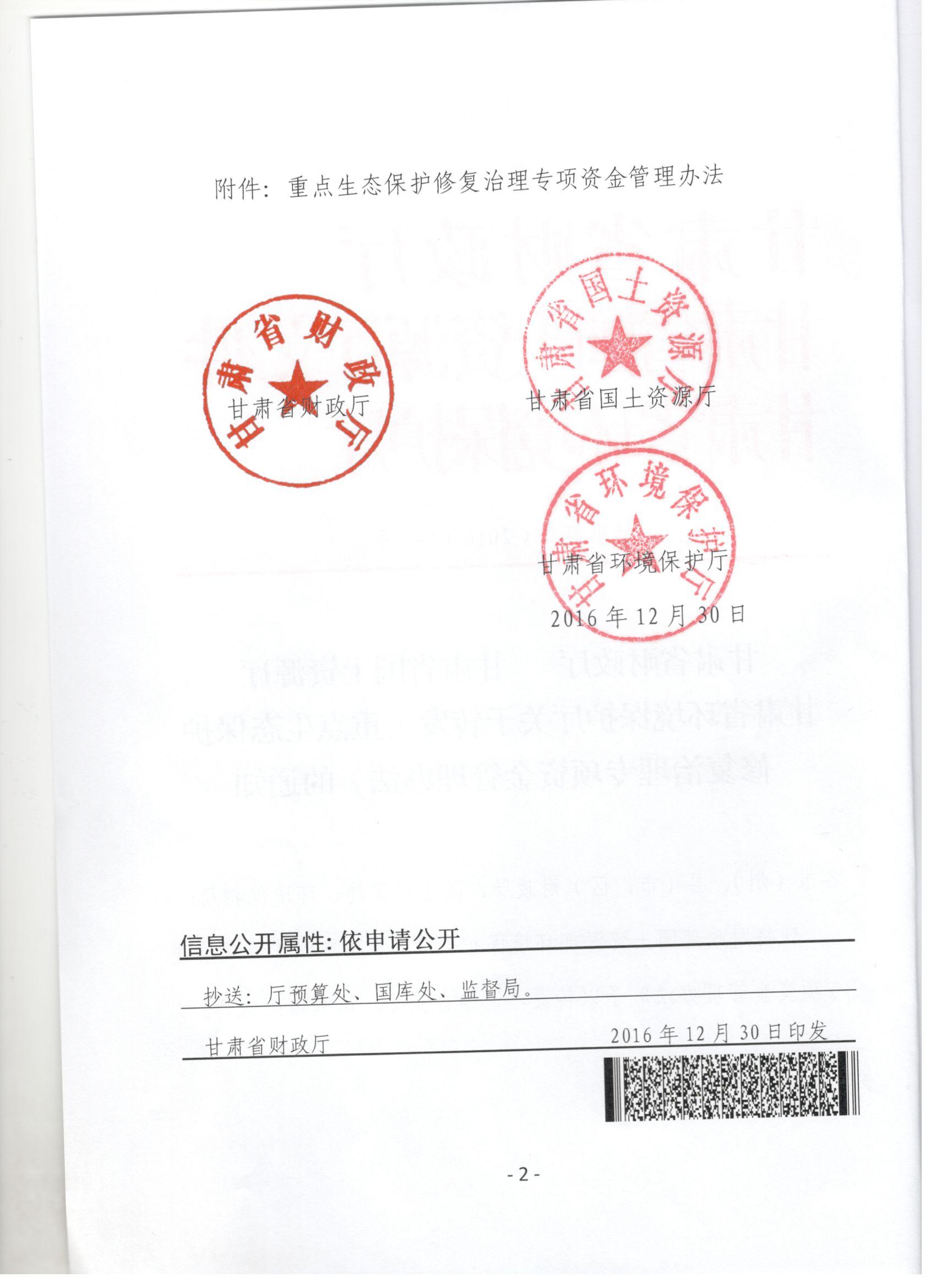甘肃省财政厅 甘肃省国土资源厅 甘肃省环境保护厅关于转发《重点生态保护修复治理专项资金管理办法》的通知