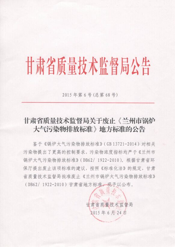 甘肃省质量技术监督局关于废止《兰州市锅炉大气污染物排放标准》地方标准的公告