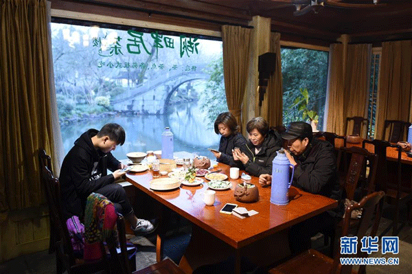 市民在杭州西湖“开心茶馆”内喝茶休闲(2016年1月5日摄)。据了解,“开心茶馆”转型前为“西湖会”,转型后成为平价茶馆。新华社记者 黄宗治 摄