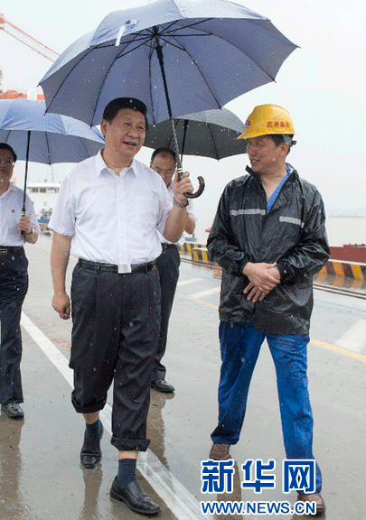 2013年7月21日至23日,中共中央总书记、国家主席、中央军委主席习近平在湖北调研全面深化改革问题和当前经济运行情况。 21日上午,习近平冒雨来到武汉新港阳逻集装箱港区考察。 新华社记者 李学仁 摄